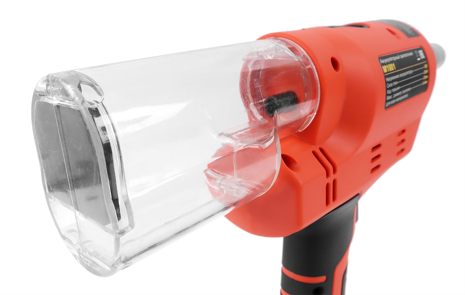 Отличительной особенностью аккумуляторного заклепочника М1001 является удержание заклепки и автоматический сбор «хвостов» уже установленных заклепок в контейнер инструмента. Удлиненные трубки-толкатели под заклепки указанных диаметров исключают заклинивание инструмента при эксплуатации.
